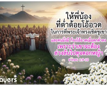 จงโอ้อวดพระเจ้าเถิด นี่เป็นคำพูดที่ไม่เกินจริงเพราะว่าพระเจ้าทรงเป็นผู้ควบคุม ทรงเป็นผู้ประทานให้ ทรงเป็นผู้ยึดคืน ทรงเป็นผู้ชอบธรรมและเที่ยงธรรมเสมอ พระองค์ทรงเห็นว่าสิ่งใดเหมาะสมสิ่งใดคู่ควร สิ่งใดไม่เหมาะสม สิ่งใดไม่คู่ควรกับมนุษย์คนหนึ่งคนใดได้อย่างถูกต้องและชัดเจนที่สุด เพราะพระองค์ทรงทราบในทุกสิ่งว่าเกิดขึ้นและเป็นมาด้วยเหตุอันใดและมีสิ่งใดอยู่เบื้องหน้าและเบื้องหลังทั้งสิ้น สิ่งที่เกิดขึ้นและเป็นไปในมนุษย์นั้นไม่มีสิ่งใดที่พระเจ้าไม่ทรงทราบ และในหลายๆ ครั้ง แม้สิ่งที่เกิดขึ้นกับมนุษย์นั้นดูเป็นสิ่งที่ไม่น่าปรารถนาสำหรับมนุษย์ก็ตาม แต่ทั้งสิ้นก็เพื่อให้มนุษย์นั้นได้เห็นพระคุณความรักของพระองค์ที่แท้จริง เช่นเดียวกันพระองค์ทรงปราถนาให้มนุษย์นั้นได้ยกย่องสรรเสริญและโอ้อวดพระนามของพระองค์ เมื่อได้รับสิ่งดีเพราะสิ่งดีๆ เหล่านั้นพระองค์ทรงเป็นพระเจ้าผู้อยู่เบื้องหลังทั้งสิ้นหรือบางครั้งมนุษย์เองอาจเผชิญกับสิ่งที่ตกต่ำก็เพื่อให้เขาเองได้ระลึกถึงและหันกลับมาพึ่งพาพระเจ้า และจะได้ขอบพระคุณและโอ้อวดพระนามของพระองค์ด้วยเช่นเดียวกัน ข้าแต่พระเจ้าที่รัก ข้าพระองค์ขอบพระคุณพระองค์ที่พระองค์ทรงให้ข้าพระองค์ได้ระลึกอยู่เสมอว่า ไม่ว่าข้าพระองค์จะเผชิญกับความมั่งมีหรือเผชิญกับความตกต่ำ พระองค์ทรงอนุญาตให้สิ่งเหล่านี้เกิดขึ้นก็เพื่อสิ่งดีแก่ข้าพระองค์เพื่อเป็นรางวัลปลอบประโลมใจ เป็นขวัญกำลังใจ หรือเพื่อเป็นการนำจิตใจของข้าพระองค์ให้จดจ่ออยู่ที่พระองค์หรือเพื่อให้ข้าพระองค์หันกลับมาหาพระองค์อีกครั้งเมื่อข้าพระองค์หลงระเริงหลงผิดไป เพื่อข้าพระองค์จะได้ขอบพระคุณและโอ้อวดประกาศพระนามของพระองค์ในทุกกรณีที่เกิดขึ้นและเป็นไปในชีวิตของข้าพระองค์ ขอให้ข้าพระองค์เรียนรู้และระลึกอยู่เสมอว่า พระองค์ทรงอนุญาตให้สิ่งต่างๆ เกิดขึ้นและเป็นไปก็เพื่อผลดีแก่ข้าพระองค์ในอนาคต คือการได้อยู่ในพระคุณความรักและพึ่งพาพระองค์เสมอไป ขอบพระคุณพระองค์ในพระนามพระเยซูเจ้า…