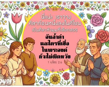 “นี่แน่ะ เราวางศิลาก้อนหนึ่งลงในศิโยน เป็นศิลาหัวมุมที่เลือกสรรอันล้ำค่า และใครที่เชื่อในพระองค์ก็จะไม่ผิดหวัง”