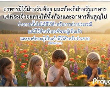 ท่านไม่รู้หรือว่าร่างกายของท่านเป็นวิหารของพระวิญญาณบริสุทธิ์ซึ่งสถิตอยู่ในท่าน ซึ่งท่านได้รับจากพระเจ้า ท่านไม่ใช่เจ้าของตัวท่านเอง และพระเจ้าทรงเป็นศีรษะของร่างกาย ดังนั้น ทั้งสิ้นในชีวิตของมนุษย์นั้นล้วนเป็นมาจากพระองค์ เพื่อพระองค์ทั้งสิ้น เพราะทุกเส้น ทุกข้อต่อ ทุกชิ้นส่วน ทุกองค์ประกอบของชีวิตล้วนขึ้นตรงต่อพระเจ้าแต่เพียงพระองค์เดียว ซึ่งพระเจ้าทรงกำหนดบทบาทหน้าที่ไว้แล้วทุกประการทั้งร่างกายและจิตวิญญาณของมนุษย์ สรรเสริญโมทนา ขอบพระคุณพระเจ้า พระเจ้าผู้ทรงเป็นเจ้าของชีวิตของข้าพระองค์ทั้งหลาย พระองค์ทรงสร้างข้าพระองค์ขึ้นด้วยพระหัตถ์ของพระองค์อย่างดีเลิศ ครบบริบูรณ์ทุกประการ เพื่อทั้งสิ้นในชีวิตของข้าพระองค์ทั้งกายใจและจิตวิญญาณเป็นที่ถวายพระสิริและพระเกียรติแด่พระองค์ ขอพระองค์ทรงโปรดเมตตา ทรงนำ ทรงปกป้องดูแลข้าพระองค์ ขอให้ชีวิตของข้าพระองค์ได้ดำเนินไปในทุกๆ วันอย่างถูกต้องตามพระประสงค์และน้ำพระทัยของพระองค์ที่ทรงมีในข้าพระองค์ด้วยเถิด ข้าแต่พระเจ้า ด้วยเรือนกายนี้ก็ดี ด้วยจิตใจภายในก็ดี ด้วยจิตวิญญาณก็ดี ทั้งสิ้นนี้ ข้าพระองค์มอบถวายแด่พระองค์ผู้เดียวในพระนามพระเยซูคริสต์เจ้า อาเมน…