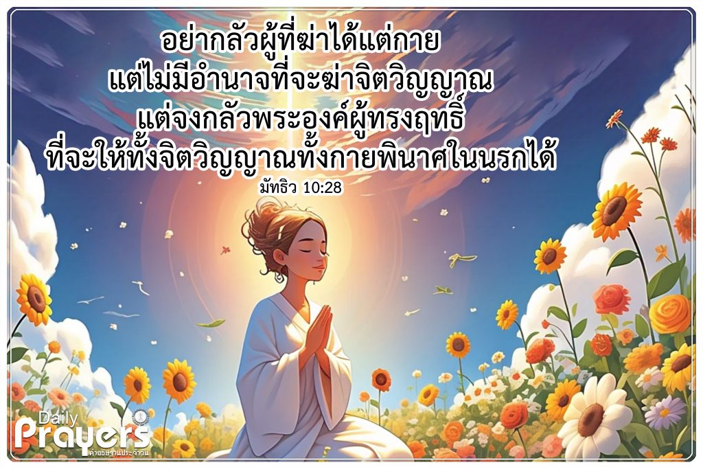 อย่ากลัวผู้ที่ฆ่าได้แต่กาย แต่ไม่มีอำนาจที่จะฆ่าจิตวิญญาณ แต่จงกลัวพระองค์ผู้ทรงฤทธิ์ ที่จะให้ทั้งจิตวิญญาณทั้งกายพินาศในนรกได้ – มัทธิว 10:28
