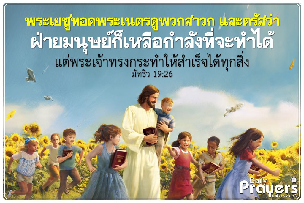 พระเยซูทอดพระเนตรดูพวกสาวก และตรัสว่า ฝ่ายมนุษย์ก็เหลือกำลังที่จะทำได้ แต่พระเจ้าทรงกระทำให้สำเร็จได้ทุกสิ่ง – มัทธิว 19:26