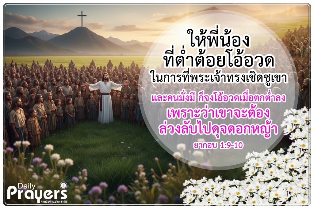 ให้พี่น้องที่ต่ำต้อยโอ้อวดในการที่พระเจ้าทรงเชิดชูเขา และคนมั่งมีก็จงโอ้อวดเมื่อตกต่ำลง เพราะว่าเขาจะต้องล่วงลับไปดุจดอกหญ้า – ยากอบ 1:9-10