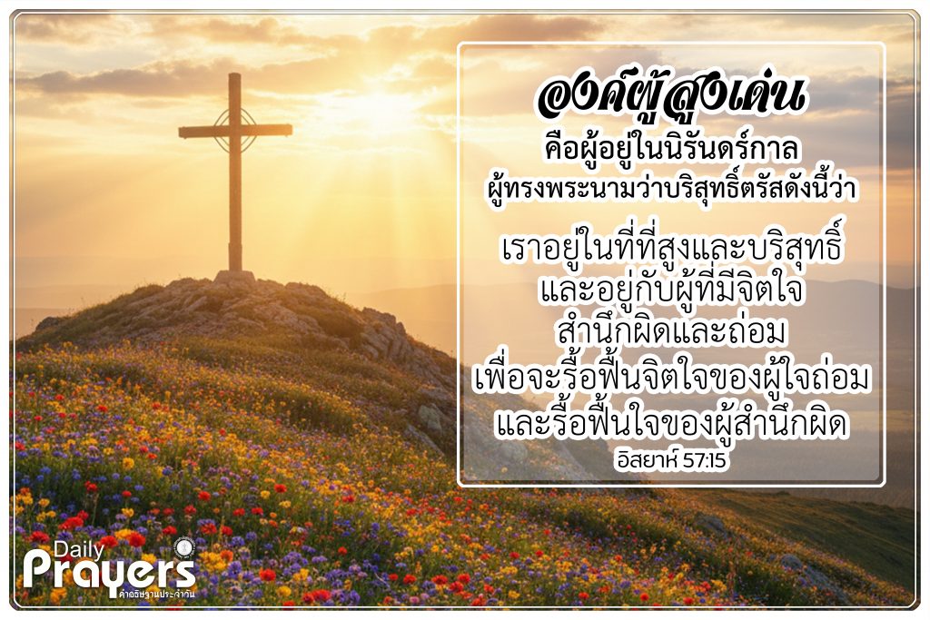 องค์ผู้สูงเด่น คือผู้อยู่ในนิรันดร์กาล ผู้ทรงพระนามว่าบริสุทธิ์ ตรัสดังนี้ว่า เราอยู่ในที่ที่สูงและบริสุทธิ์ และอยู่กับผู้ที่มีจิตใจสำนึกผิดและถ่อม เพื่อจะรื้อฟื้นจิตใจของผู้ใจถ่อม และรื้อฟื้นใจของผู้สำนึกผิด – อิสยาห์ 57:15