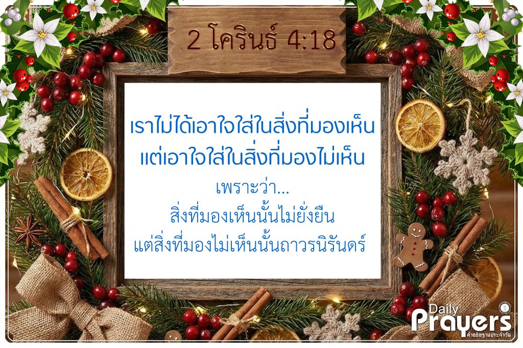 เราไม่ได้เอาใจใส่ในสิ่งที่มองเห็น แต่เอาใจใส่ในสิ่งที่มองไม่เห็น เพราะว่าสิ่งที่มองเห็นนั้นไม่ยั่งยืน แต่สิ่งที่มองไม่เห็นนั้นถาวรนิรันดร์ – 2 โครินธ์ 4:18
