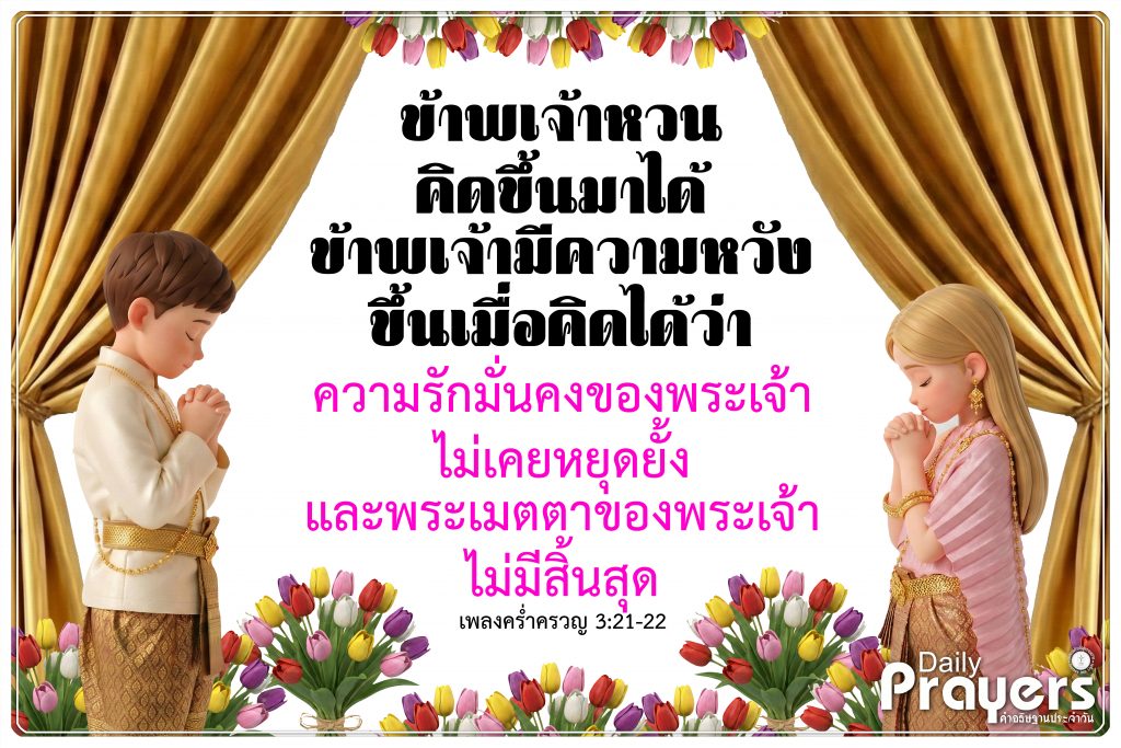 ข้าพเจ้าหวนคิดขึ้นมาได้ ข้าพเจ้ามีความหวังขึ้นเมื่อคิดได้ว่า ความรักมั่นคงของพระเจ้าไม่เคยหยุดยั้ง และพระเมตตาของพระเจ้าไม่มีสิ้นสุด – เพลงคร่ำครวญ 3:21-22
