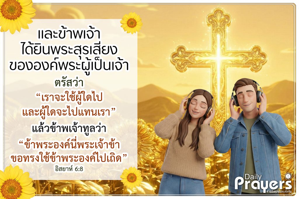 และข้าพเจ้าได้ยินพระสุรเสียงขององค์พระผู้เป็นเจ้าตรัสว่า “เราจะใช้ผู้ใดไป และผู้ใดจะไปแทนเรา” แล้วข้าพเจ้าทูลว่า “ข้าพระองค์นี่พระเจ้าข้า ขอทรงใช้ข้าพระองค์ไปเถิด” – อิสยาห์ 6:8