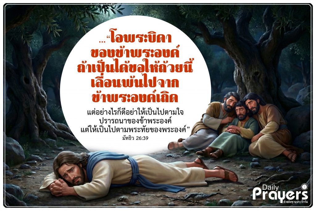 …“โอพระบิดาของข้าพระองค์ ถ้าเป็นได้ขอให้ถ้วยนี้เลื่อนพ้นไปจากข้าพระองค์เถิด แต่อย่างไรก็ดี อย่าให้เป็นไปตามใจปรารถนาของข้าพระองค์ แต่ให้เป็นไปตามพระทัยของพระองค์” – มัทธิว 26:39
