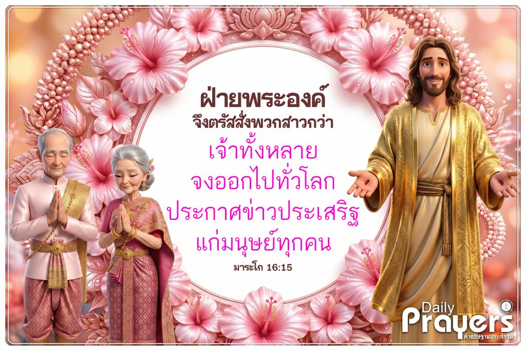 ฝ่ายพระองค์จึงตรัสสั่งพวกสาวกว่า เจ้าทั้งหลายจงออกไปทั่วโลก ประกาศข่าวประเสริฐแก่มนุษย์ทุกคน – มาระโก 16:15